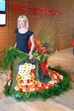 Zwei junge Damen schwebten im Anthurien- beziehungsweise Gerbera-Reifrock durch das Foyer und den Prinz-Claus-Saal und erinnerten daran, dass der Blumenexport ein wichtiger Wirtschaftsfaktor der Niederlande ist. Im Anthurienrock wurden 600 Anthurien von Orange über Rot bis Braun und etwa 450 Anthurienblättern verarbeitet. (BBH)
