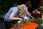Sieben Aufgaben zu unterschiedlichen Themen waren gestellt, und gleich die erste war sozusagen die Kür: das Binden eines üppigen Sommerstraußes in 30 Minuten. Bei der Gestaltung eines Tischschmucks (Foto)war neben dem floristischen Können, vor allem Kreativität bei der Umsetzung gefragt. Die Teilnehmerinnen sollten ohne die sonst gebräuchliche Steckmasse arbeiten und aus den bereitgestellten Materialien Alternativen entwickeln. Ein weiteres Highlight war die Anfertigung eines blumigen Gastgeschenkes. Eine Einzelblüte sollte durch verschiedene Dekorationselemente exklusiv in Szene gesetzt werden. Bei der Bepflanzung einer Pflanzschale durften die Teilnehmerinnen aus einer Vielzahl von Pflanzen und Materialien auswählen und für einen sonnigen Südbalkon eine Bepflanzung entwickeln und praktisch umsetzen. Wichtig war hier, eine standortgerechte Pflanzenauswahl zu treffen. Ob bei der Rechnungserstellung, beim Lösen von Fragen rund um die Farblehre oder bei der Prüfung der Pflanzenkenntnisse, jeder Wissensbereich wurde abgedeckt.