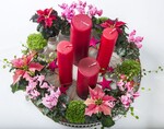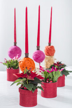 Adventlicher Bausatz: Dieses Werkstück ist eine Alternative zum klassischen Kranz. Weihnachtssterne und Weihnachtskakteen werden in Glastöpfe, die mit Stoff verkleidet sind, gepflanzt. Für die Kerzen werden Steckschaum-Kugeln mit Stoffstreifen oder Garn umwickelt und auf Holzklötzen fixiert. Auf der Kugel werden Kerzenhalter befestigt. Die einzelnen Bestandteile können ringförmig oder in Reihen angeordnet werden, die Farben lassen sich individuell kombinieren.