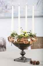 Adventskranz aus Rindenstücken: Bei diesem Kranz auf einem Pokal sorgen Rindenstücke für einen frischen und natürlichen Look. Als Basis dient ein Strohkranz. Er wird mit Rindenstücken beklebt, dann werden Kerzenhalter für lange Kerzen befestigt. Für die „Füllung“ wurden Weihnachtssterne und Kalanchoen in hellen, zarten Farben sowie Drahtwein und kleine grüne Äpfel gewählt. Für den letzten Schliff sorgen Sterne aus Rindenfurnier und handgeschöpftem Papier.