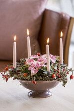 Adventskranz aus Flechtenzweigen: Einen Kranz aus Flechtenzweigen wird auf den Rand eines Keramikgefäßes gelegt - das Gefäß gibt dem Kranz einen eleganten Look. Mini-Weihnachtssterne und Hauswurz in die Mitte der Schale pflanzen, die Erde mit Moos abdecken, das Arrangement mit Naturzweigen dekorieren, vier Kerzenhalter für Weihnachtsbaumkerzen in den Kranz stecken!