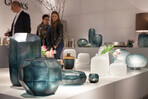 Im Bereich der Glaswaren spielen Farbe und Haptik eine große Rolle. Wasser wird in monochrom farbigen Gläsern angeboten – angefangen bei kräftigen Farben bis hin zu Erd- und Rauchtönen. Die Oberfläche der Wassergläser ist entweder glatt oder reliefiert. Die Formen der stets klaren und nicht farbigen Weingläser dagegen werden wieder organischer. XXL wird hier im wahrsten Sinne des Wortes ganz groß geschrieben. Expressionistisch wird es im Bereich der Dekorations- und Geschenkartikel aus Glas mit farbigen Figuren.