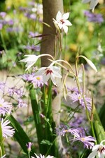 - Gladiolus callianthus ‚Murielae‘ (Abessinische Gladiole) ist eine Sommerblumenzwiebel mit herrlichem Duft und einem schwertförmigen Blatt mit hohem Zierwert. Sie blüht spät in der Saison mit weißen, sternförmigen Blüten und bordeauxrotem Herz.