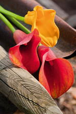 - Zantedeschie (Calla) hat ein dekoratives Blatt und lange Stängel mit eleganten Blüten. Calla sind in einer enorme Farbenvielfalt verfügbar.
