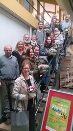 Für einen krönenden Abschluss eines erfolgreichen Tags sorgten öffentlichkeitswirksame Flashmob-Aktionen in Köln und Düsseldorf. Auf der Domplatte in Köln und vor dem Schauspielhaus in Düsseldorf wurde ein überdimensionales Peace-Zeichen, bestehend aus den floralen Werkstücken des Workshops, auf den Boden „projiziert“. Und in Oberhausen wurde die Werkstücke im Rahmen einer kleinen Zeremonie, bei der auch einige lokale Pressevertreter anwesend waren, an die Bewohner einer Seniorenresidenz übergeben.