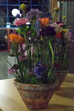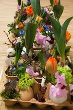 Ihre Werkstücke hatten sie überwiegend in Serien in unterschiedlichen Größen oder Varianten gefertigt, beginnend mit Pflanzungen. Für eine 3er-Serie Moosschalen hatten sie an Styropor-Halbschalen Moos mit Wickeldraht befestigt und die Schalen bepflanzt mit Drainage und Erde ohne Folie, also für den Außenbereich. Gefüllt waren sie mit Frühlingsblühern wie Fritillaria oder Edelprimeln, dekoriert mit Eiern, Spinosa und Lindenzweigen. Für weitere Pflanzungen verwendeten sie Baumscheiben, in die Löcher gebohrt wurden, um Glasröhrchen hinein zu stellen für 3 oder 4 Blumen, als Dekoration Moos, Eier und Federn dazu. Dabei zeigten sie auch eine dauerhafte Arbeit mit Floralien, die schön eintrocknen, wie Craspedia und vergoldete Eukalyptusblätter. Sehr dekorativ sind auch klassische Harztöpfe, floral bunt ausgesteckt.