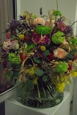 Christina Müglich fertigte einen kleineren kompakten Stehstrauß. Damit er steht, müssen die Stiele in der Mitte kürzer sein als außen. „Wenn Sie so einen Strauß auf die Theke stellen“, sagte sie dazu „erzielen Sie gleich einen Aha-Effekt beim Kunden.“