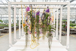 Einen echten Blickfang im Urban Style zaubert uns Leoni Gehr (Floristmeisterin; u.a. ARD Buffet) anlässlich des 20. BGN-NWFC in den Abholmarkt. Gartenschläuche, glänzend-schwarz und fröhlich-gelb, schlängeln sich durch ein Vanda-Arrangement. Die Orchidee mit violetten, pinken und orangefarbenen Blüten lebt in der Natur auf anderen Pflanzen („epiphytisch“) – hier wird sie ganz modern von Kleiderbügeln in knalligem Gelb und Pink kontrastiert. Das alles vor einer ebenso bunten Tapete in Backsteinoptik platziert, und der florale Großstadtdschungel ist perfekt!