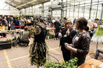 Das Highlight des Tages war die Bühnenarbeit unter den Augen von Kunden, Chefs, Freunden und Familien. Denn die Teilnehmer fertigten, erstmals mit Hilfe eines mitgebrachten Partners, ein florales Kleidungsstück. Kleid, Rock, ganz egal – Hauptsache zu einem Großteil körperbedeckend.
