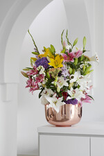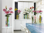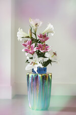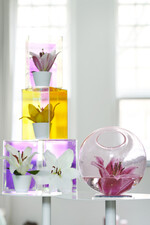Eine moderne und attraktive Form der Lilienpräsentation ist die Verwendung irisierender Vasen und Schalen, vorzugsweise in lila-rosa-gelb Nuancen. Lilien, die vom Blütenstiel abgebrochen sind, eignen sich als Schwimmblüten für Gefäße in Würfel- oder Kugelform. Es darf ein wenig so aussehen, als wäre ein Professor damit beschäftigt, fröhlich in seinem Labor zu experimentieren.
