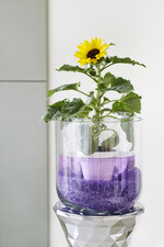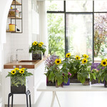 Die Sonnenblume wächst als Zimmerpflanze nicht so hoch wie im Garten, aber sie hat auch diese einzigartigen, fröhlichen Blüten und das dunkle Herz einer echten Sonnenblume. Topfsonnenblumen wurden so gezüchtet, dass sie keinen Blütenstaub abgeben. Ein paar Sonnenblumen in einem Kasten oder in einer Gruppe vermitteln das Gefühl eines blühenden Feldes. Ein Hauch Lila oder Violett passt dazu, um das ganze Gelb optisch etwas abzukühlen.