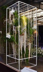 Überall im Raum verteilt hängen große Weiden- und Rebenkonstruktionen von der Decke oder bilden den Mittelpunkt der flexiblen Beete. Ausstaffiert sind sie mit einer Vielfalt an weißen Blüten, darunter Vanda-Orchideen und Edgeworthia chrysantha. Mittelpunkt ist eine Art Hochzeitspavillon mit hängenden weißen Bändern. Die Beete sind voller weißer Hortensien und weißen Anthurien. Über Vasen thronen große stachelige Kugeln aus Turmschnecken.