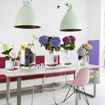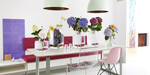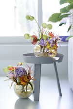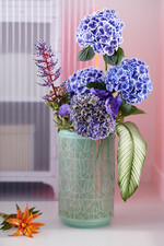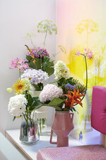 Für die Präsentation wird empfohlen: Um einen ruhigen, trendigen Look zu erzeugen, stylt man Hortensien in kühlem, hellem Glas, umgeben von Farben wie Lila, Rosa und Gelb. Das Hinzufügen einiger exotischer Blüten bringt Leben in den Hochsommerstrauß und sorgt für einen lockereren Aufbau des Arrangements.