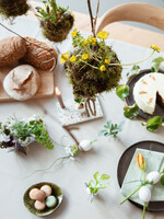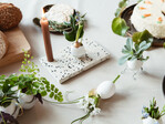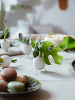 Pflanzenfreude.de verleiht dem traditionellen Ostertisch in diesem Jahr mit einem Pflanzenbuffet einen grünen Look. Eierschalen verwandeln sich in kleine Pflanzenvasen, Kokedamas werden mit saisonalen Pflanzen gefüllt und über den Tisch gehängt. Und weil nicht alle gemeinsam an einem Tisch Platz nehmen können, gibt es keine gedeckte Tafel, sondern ein dekoriertes Buffet mit schönen Dingen, die man mit Pflanzen gestalten kann.