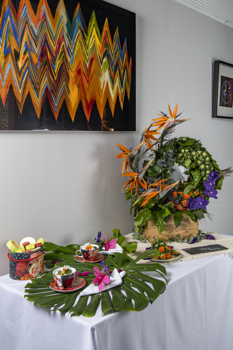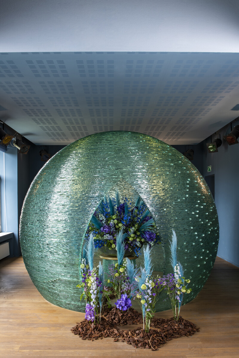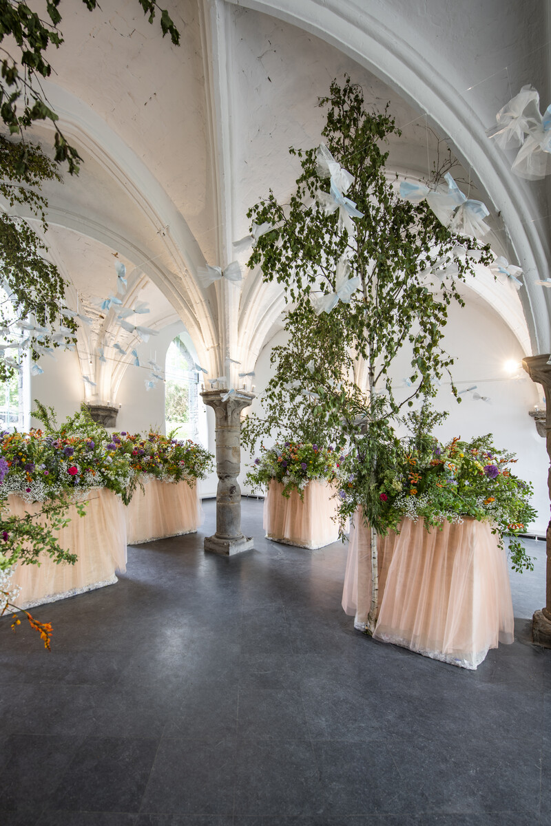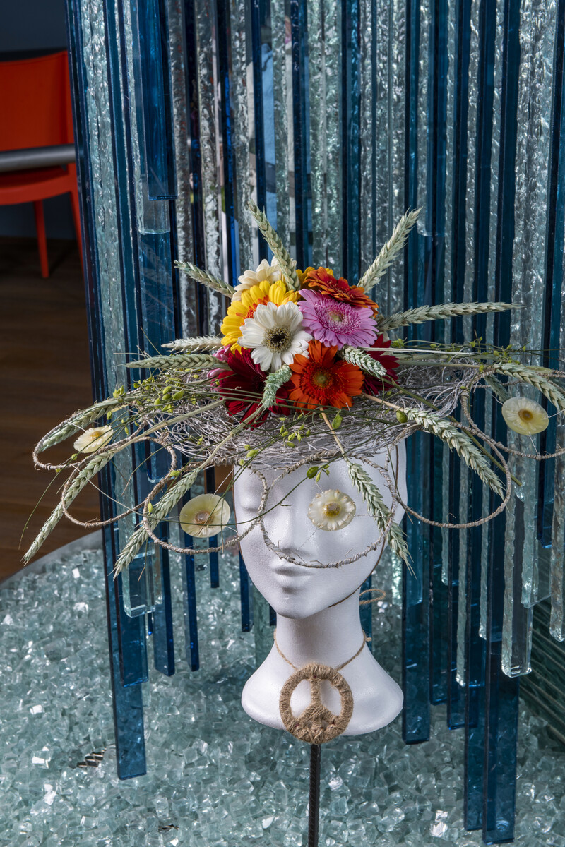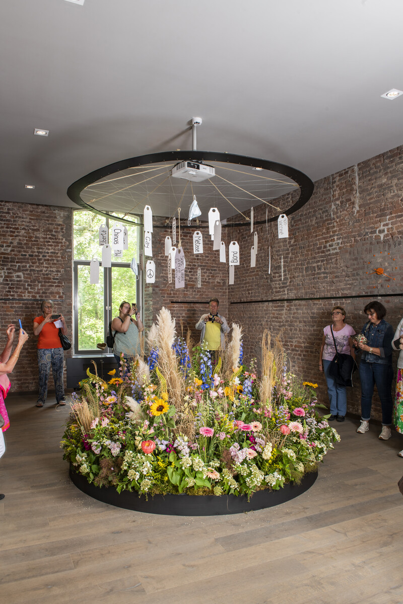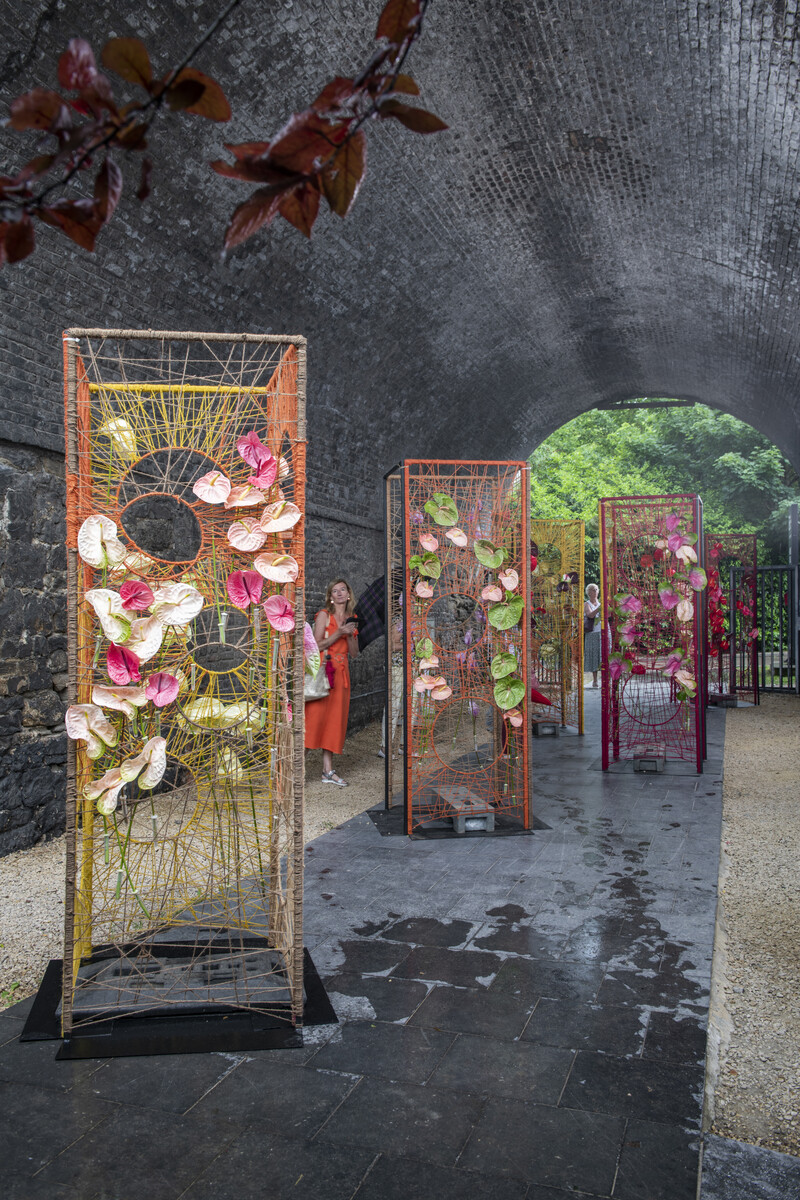 Die Floristin Rita Van Gansbeke hat eine verspielte, farbenfrohe Dekoration geschaffen, die Lust auf den Sommer macht. Auch Florent Dodeigne brachte eine bunte Mischung aus Blumen und Farben mit. Über seiner floralen Struktur mit dem Titel "Au-delà des limites" schwebte ein Kronleuchter aus Etiketten, mit denen er das Schubladendenken anprangert und für eine Welt plädiert, in der jeder er selbst sein kann.