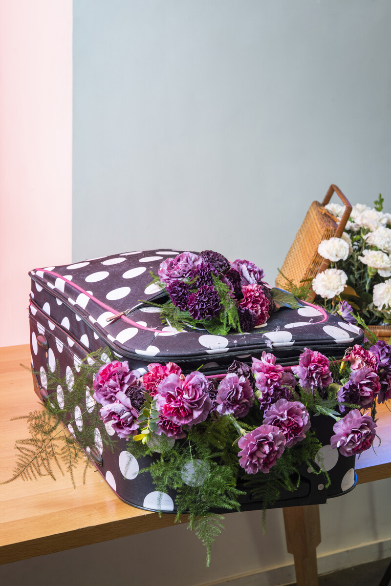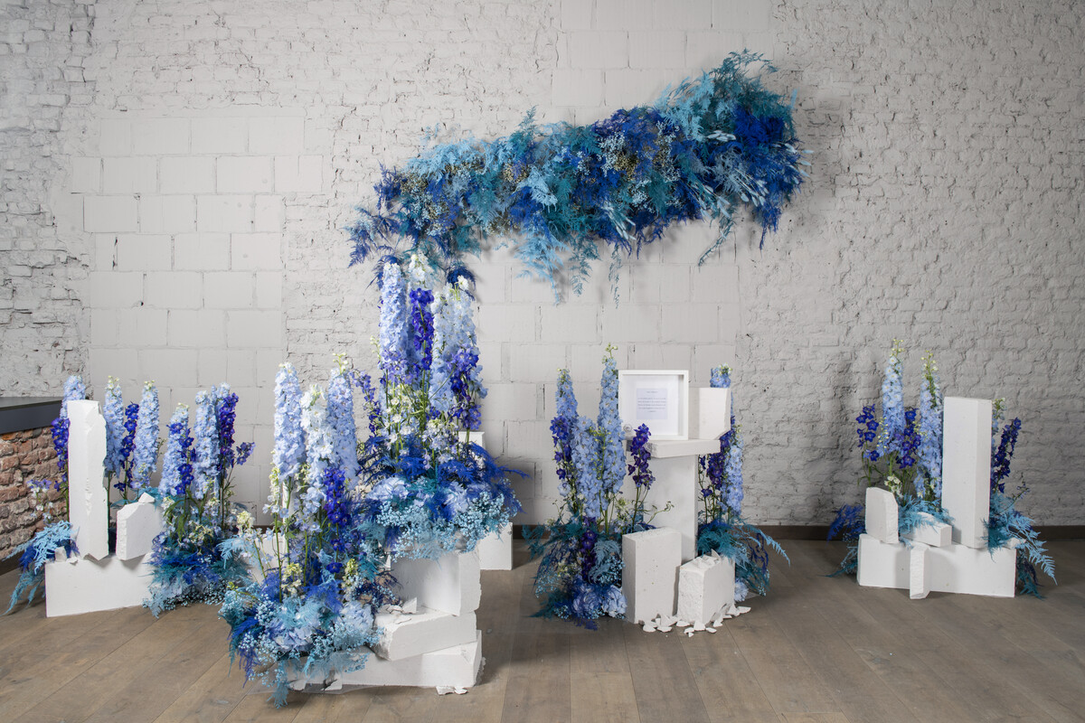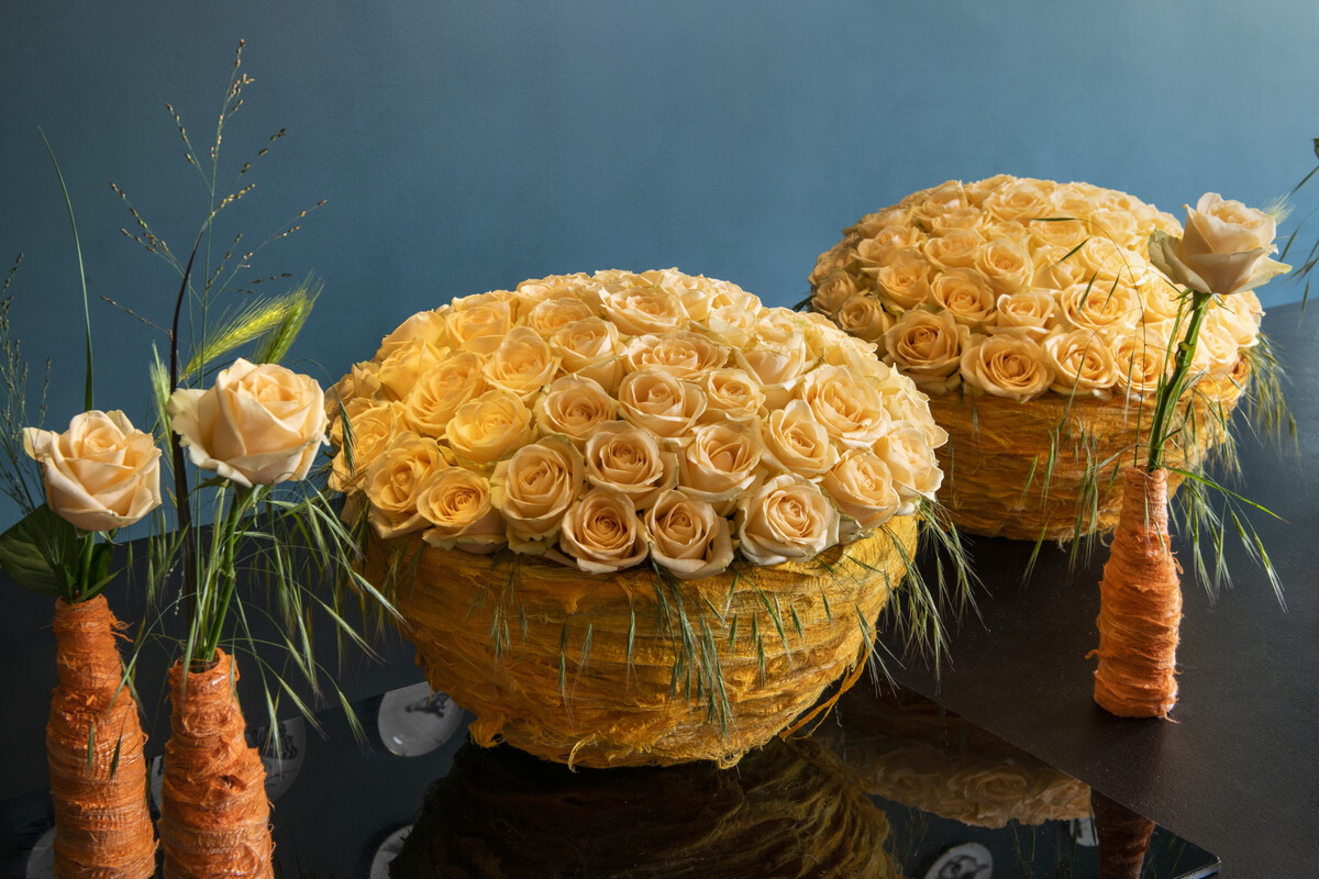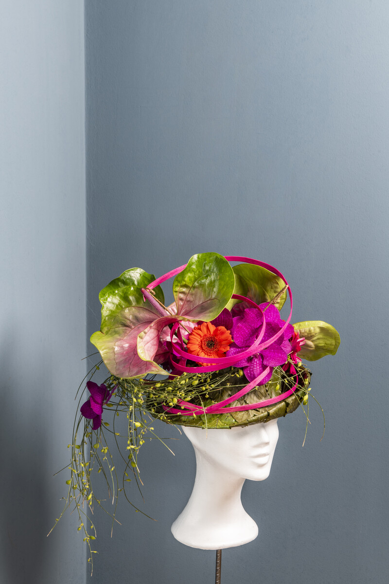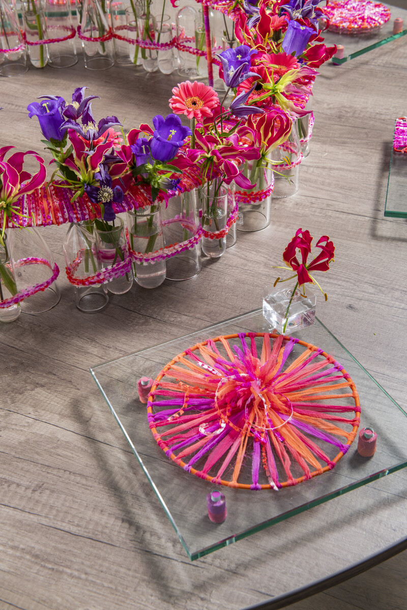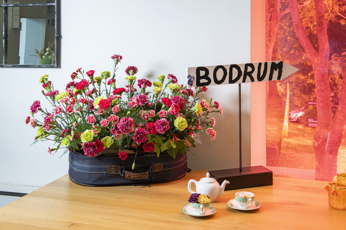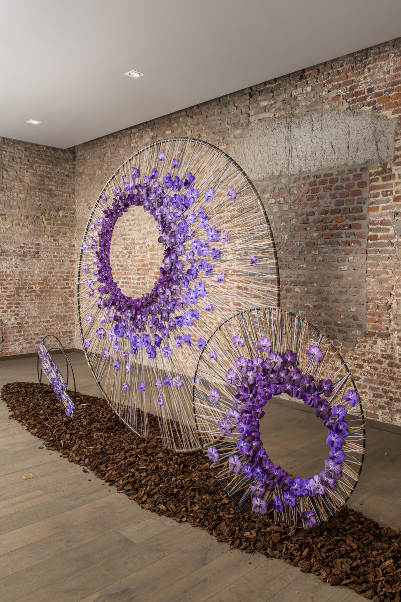 Die Floristin Rita Van Gansbeke hat eine verspielte, farbenfrohe Dekoration geschaffen, die Lust auf den Sommer macht. Auch Florent Dodeigne brachte eine bunte Mischung aus Blumen und Farben mit. Über seiner floralen Struktur mit dem Titel "Au-delà des limites" schwebte ein Kronleuchter aus Etiketten, mit denen er das Schubladendenken anprangert und für eine Welt plädiert, in der jeder er selbst sein kann.
