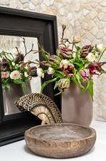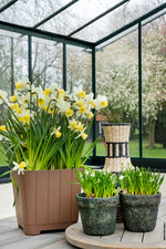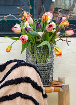 Blumenarrangements haben einen wilden, natürlichen Look. Bei Zwiebelgewächsen darf die Zwiebel sichtbar sein. Sie können zum Beispiel in Glasbehälter mit farbigen Sandschichten gesetzt werden, sodass die Erde gut zu sehen ist. Grundsätzlich darf gemischt werden: Blüh- zusammen mit Grünpflanzen erzeugen Dschungel-Feeling