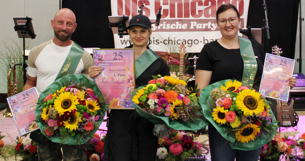 Am Samstag, 13. September 2025, beging die Neue Blumengroßmarkt München Betriebs GmbH ihr 25-jähriges Jubiläum mit einem großen Fest. Höhepunkt war ein Floristikwettbewerb mit sieben Teilnehmerinnen und Teilnehmern, die jeweils drei Werkstücke fertigten. Bereits beim Eintreffen wurden die Gäste mit einem floralen Raumschmuck empfangen. Vor Publikum entstanden zudem ein Strauß und eine Tischdekoration – alles unter dem Motto der Vielfalt der Blumengroßmarkt-Anbieter aus Bayern und der ganzen Welt.