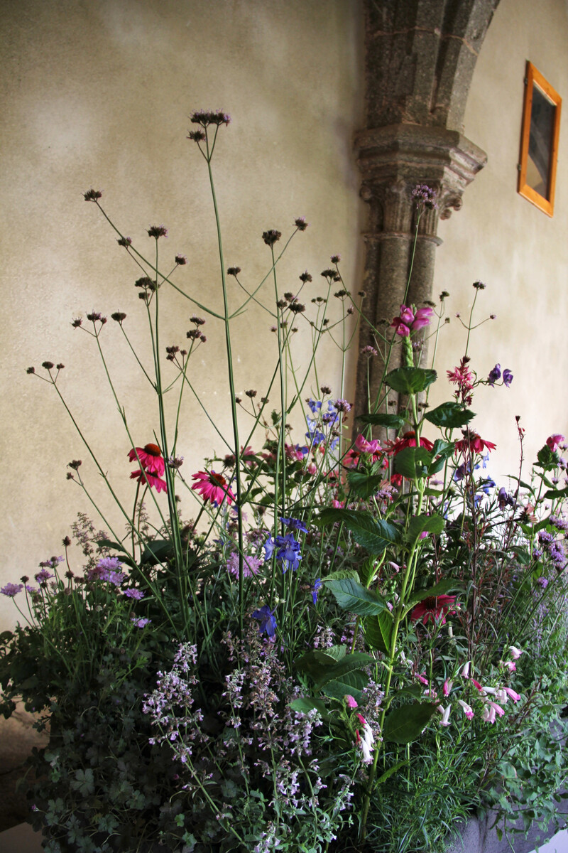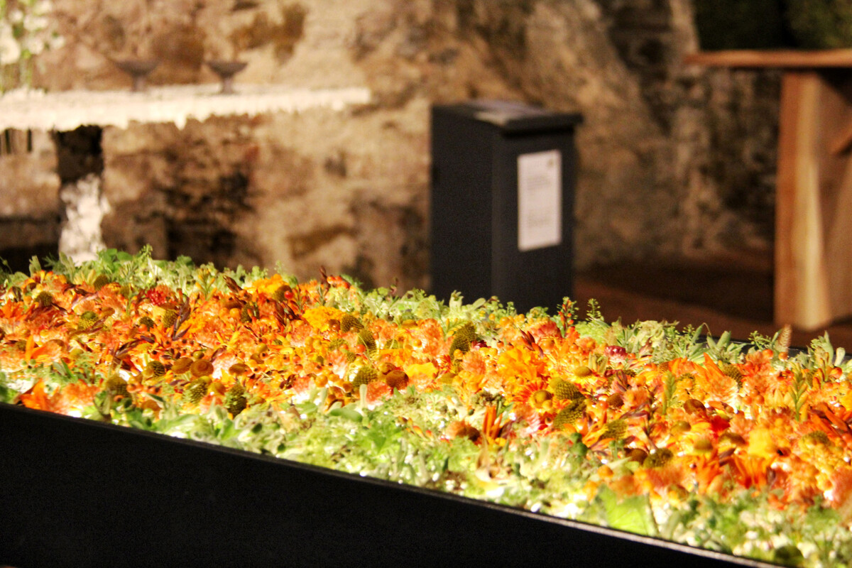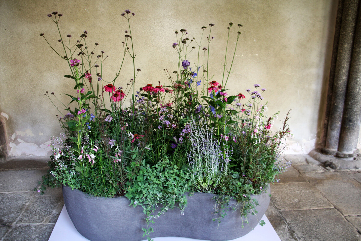 Nach Eintritt ins Stift erwarteten die Besuchenden im Kreuzgang die Pflanzarbeiten der Klasse. Um alle Pflanzungen, für drinnen und draußen, gemeinsam präsentieren zu können, wurden der Kapitelsaal und der angrenzende Kreuzgang genutzt. Beurteilt werden in der Prüfung auch die Pflanzensoziologie, die Zusammenstellung der Pflanzen in Bezug auf Standort und Pflegeansprüchen.