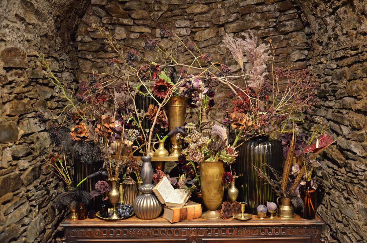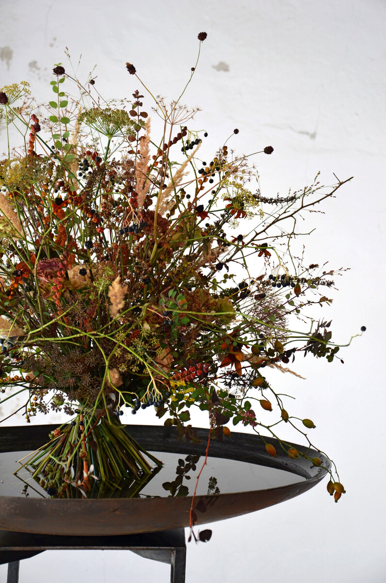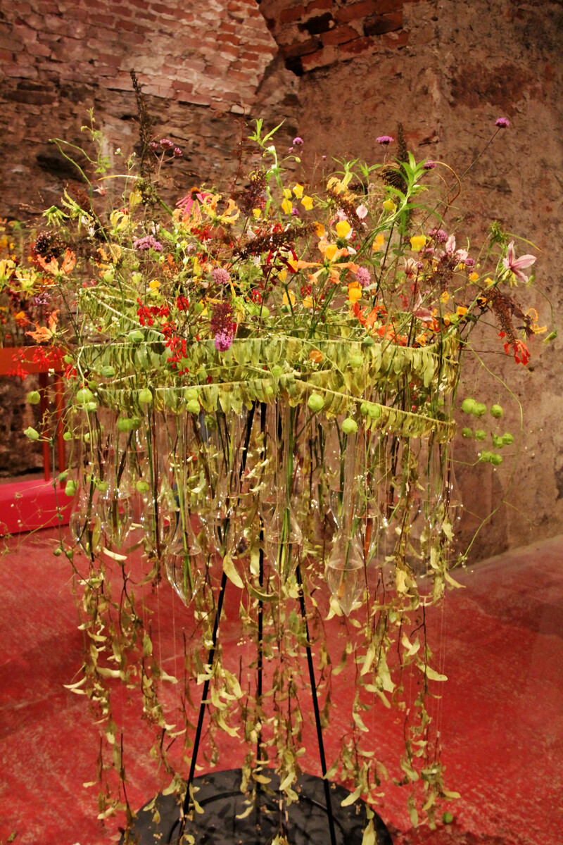 Im Eingangsbereich bei der Kasse komme ich mit Absolventinnen ins Gespräch. Delphine Engstfeld, 24 Jahre, ist gebürtig aus Norddeutschland. Da sie keinen Führerschein hat und sie Wege sparen wollte, ist sie für den Meisterkurs nach Österreich gezogen. Sie arbeitet bei Blumen Kral in Krems-Stein: „Ich habe mich für die Akademie für Naturgestaltung entschieden, weil mir die Wildheit und Natürlichkeit der Floristik gefallen hat. Außerdem wird hier sehr viel Wert auf Farbgestaltung gelegt. Das hat mich angesprochen.“ Sie beschreibt sich als fröhlich und aufgeschlossen. Als Baum für die Themenarbeit hat sie die Erle gezogen. „Die Erle ist eher düster und wird mit dem Tod und dunklen Geistern verbunden, damit konnte ich erst einmal gar nichts anfangen. Der Baum erschien mir trostlos und negativ besetzt.“ Engstfeld recherchierte weiter: „Bei meiner Suche habe ich gefunden, dass sich aus Erle Tinte gewinnen lässt. Schwarz, grün, orange.“ Da Engstfeld Linkshänderin ist, so erzählt sie lachend, hat sie mit Tinte und Tintenflecken sehr viel Erfahrung in ihrer Schullaufbahn gemacht. „Ich habe diese Idee für meine Gestaltung herausgegriffen und habe mit Tintenfässern und Pflanzen einen farbigen Tintenfleck gestaltet.“