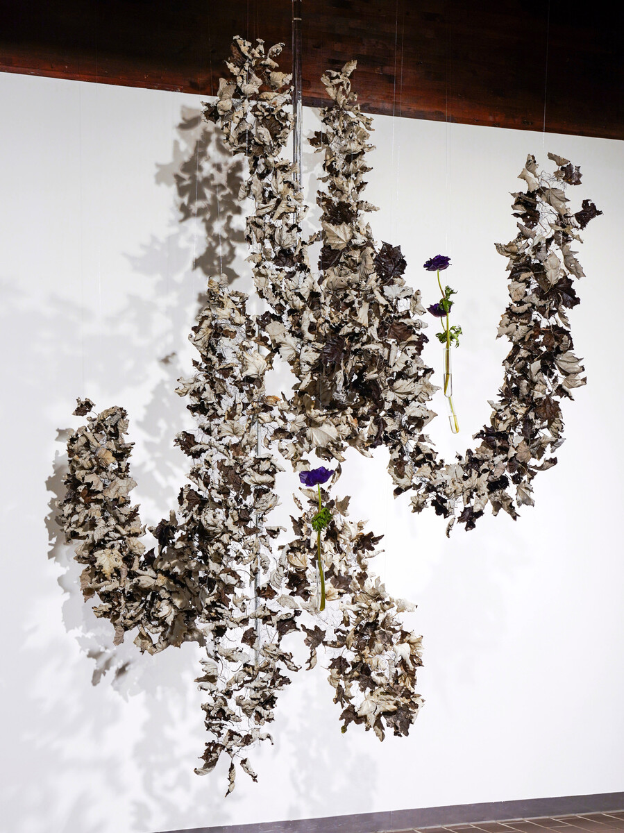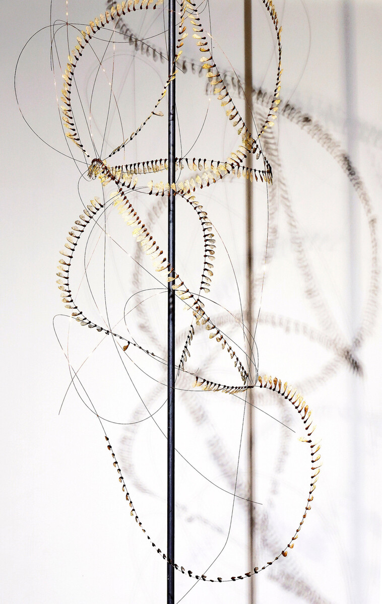 Das wollige Weiß eines Winterpullovers sieht Somi Choi in ihrer Arbeit aus Miscanthus sinensis . Sie fädelt die Halme des Chinaschilfs auf zwei Wickeldrähte und arrangiert die so entstandenen „Schals“, die eine Gesamtlänge von etwa 9 m haben, um die Stange. Einzelne Partien hängen mit einem Baumwollfaden an der Decke, um mehr Volumen zu erhalten. In seiner fernöstlichen Schlichtheit und Eleganz wirkt das Werkstück zugleich umarmend und wärmend. © Kerstin Gramberg