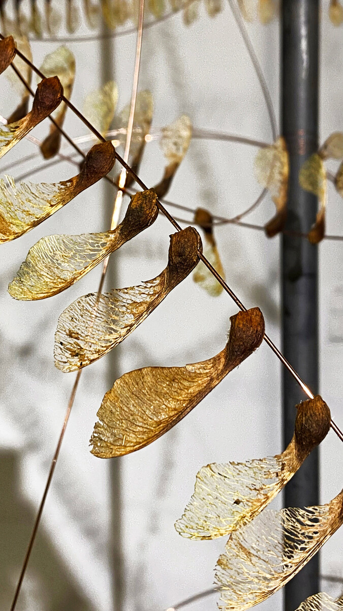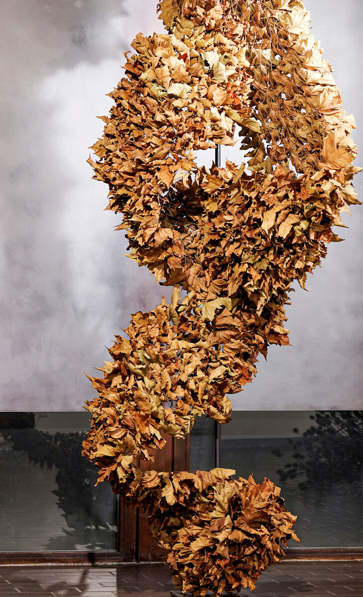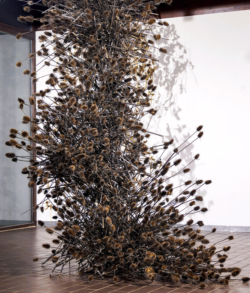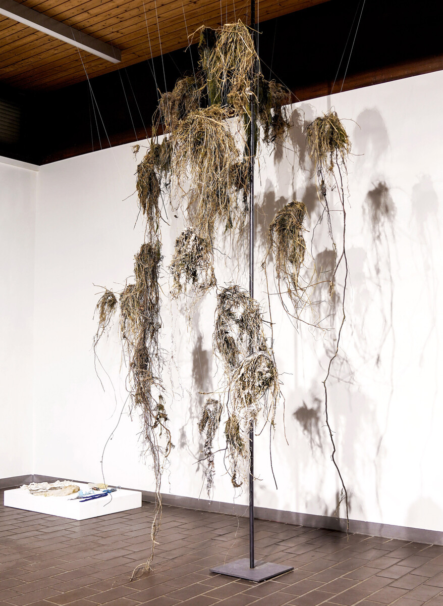 . Sie fädelt die Halme des Chinaschilfs auf zwei Wickeldrähte und arrangiert die so entstandenen „Schals“, die eine Gesamtlänge von etwa 9 m haben, um die Stange. Einzelne Partien hängen mit einem Baumwollfaden an der Decke, um mehr Volumen zu erhalten. In seiner fernöstlichen Schlichtheit und Eleganz wirkt das Werkstück zugleich umarmend und wärmend.
