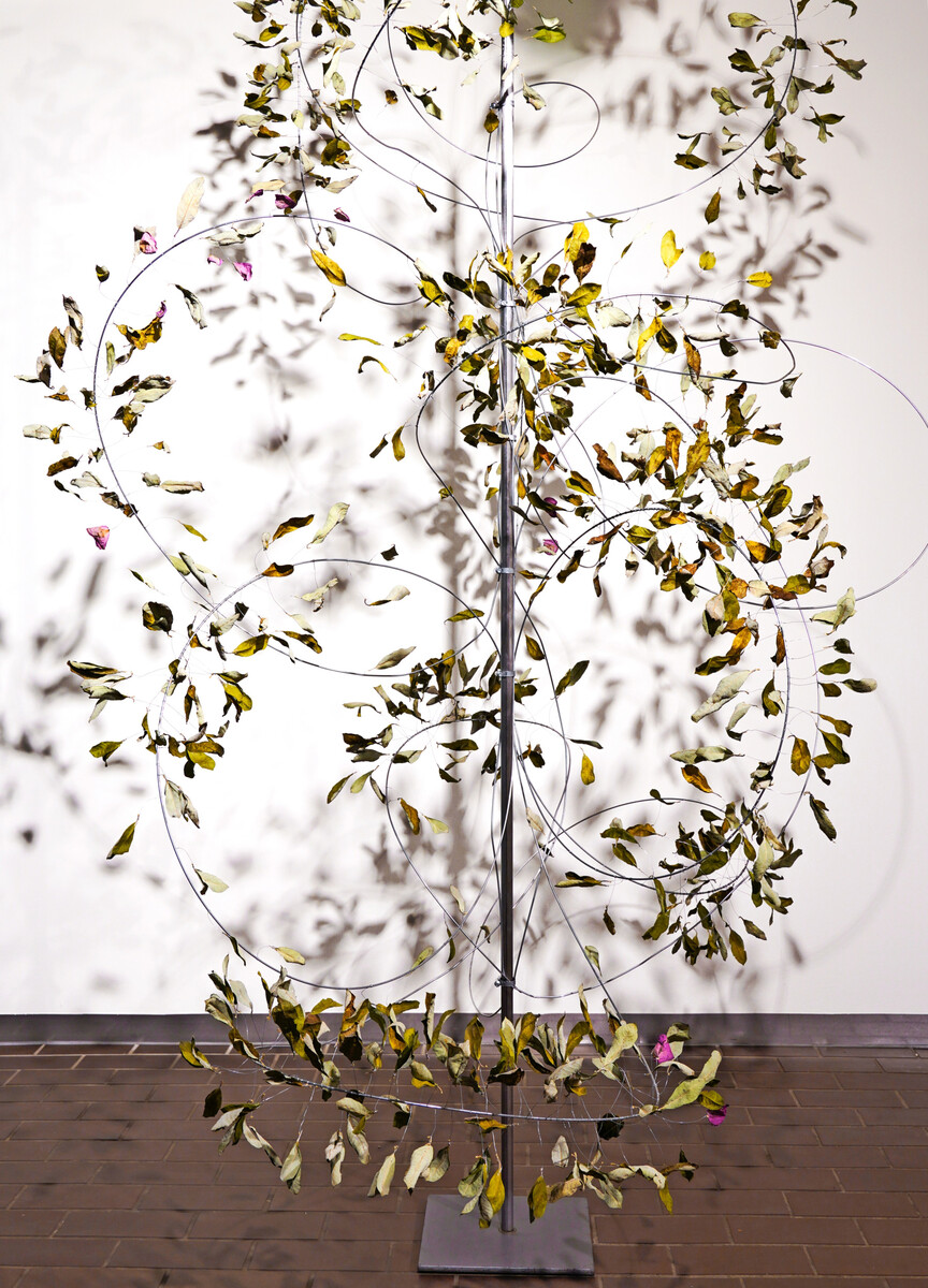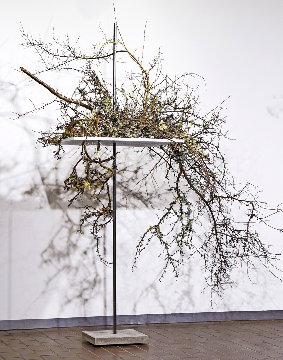 Zunächst spüren die Studierenden im heimischen Wald- und Gartenmilieu Werkstoffe auf, die sie anschließend in Form einer Stele inszenieren. Als technische Grundlage fungieren ein Metallrohr und ein Metallfuß. Der Werkstoff soll im finalen Objekt im Vordergrund stehen und Form, Ausmaß und Ausdruck der floralen Arbeit bestimmen. Eine nachhaltige Technik – verrottbar oder wiederverwendbar – ist selbstredend.