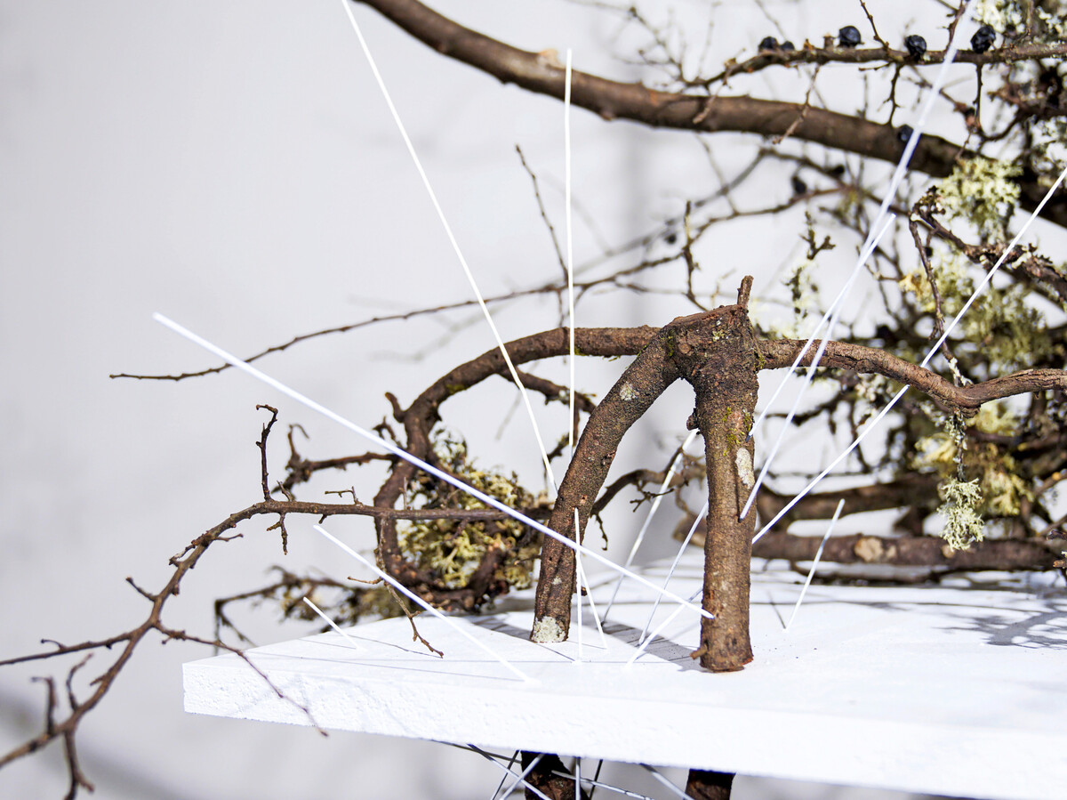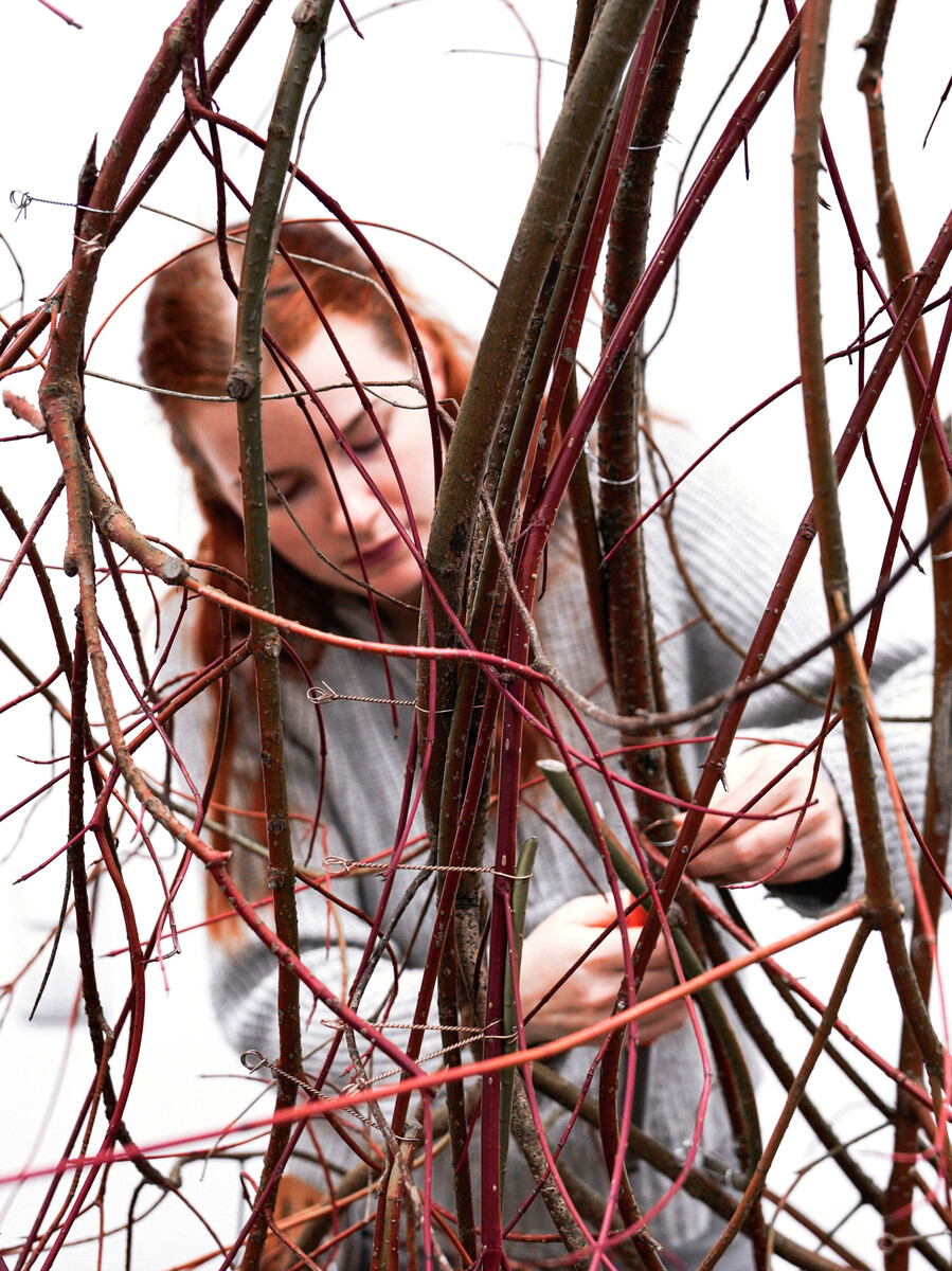 Theresa Arndt verwindet Zweige der Hänge-Birke ( Betula pendula ) zu einer nestartigen Behausung, die sich nach oben hin elegant in mehrere gewundene Stränge auflöst. So weich der einzelne Zweig der Birke sein mag, so stabil ist das gewundene Werkstück. © Kerstin Gramberg
