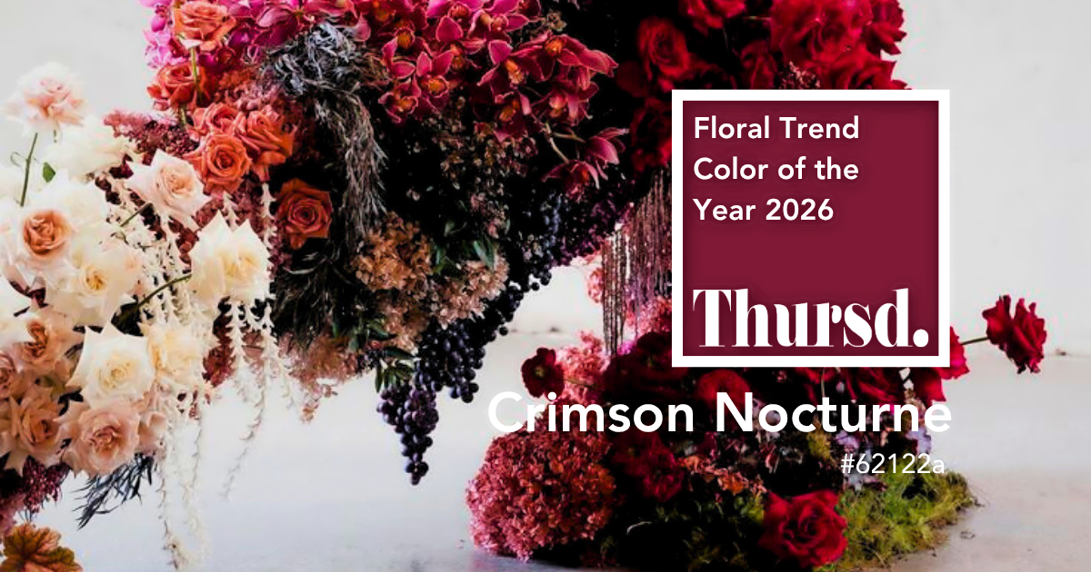 Thursd lädt alle dazu ein, ihr Design mit der Trendfarbe zu posten und folgende Hashtags dafür zu verwenden: #ThursdFloralTrendColor2026 #FloralTrendColor2026 #TrendColor #CrimsonNocturne.