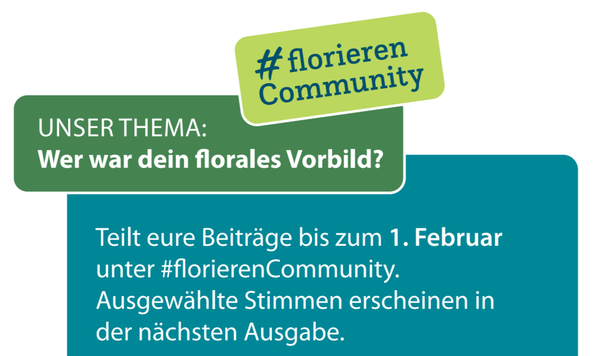 Für die kommende Ausgabe soll es passend zum Fokus-Thema Ausbildung um Vorbilder gehen. Uns interessiert: Wer war ihr florales Vorbild? Egal ob großer Name, ein Ausbilder oder Chef oder jemand, der nie im Rampenlicht stand – wir möchten diese Menschen sichtbar machen.