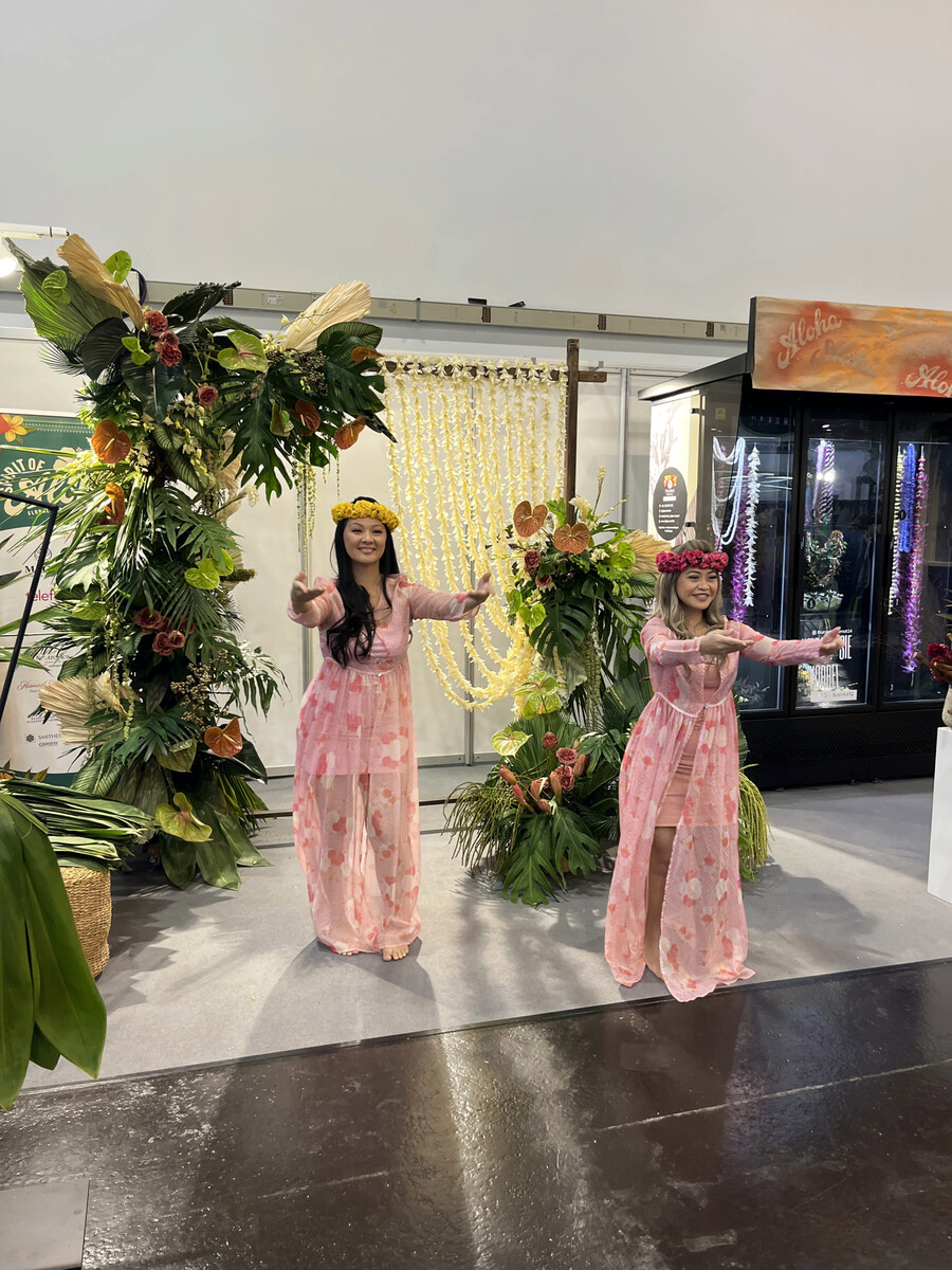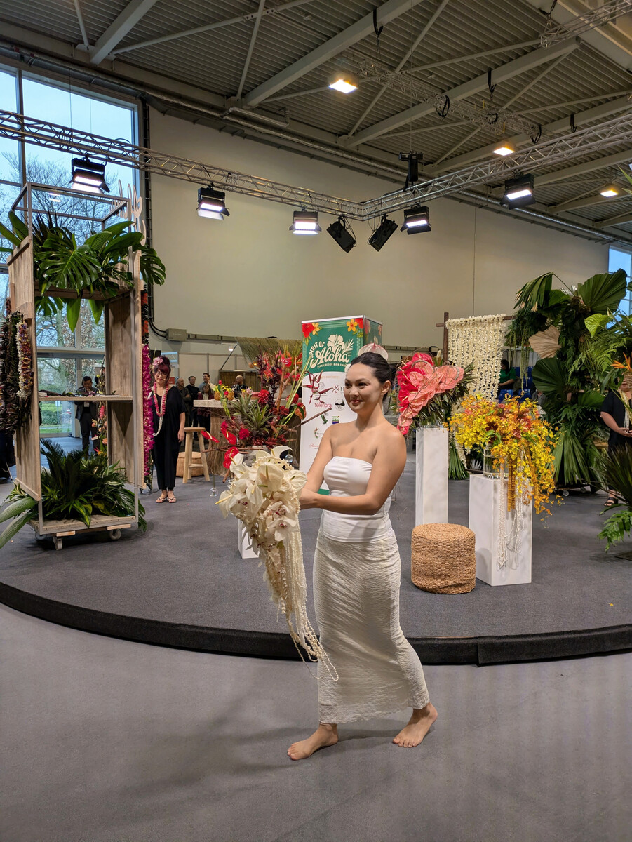 Die Show mit den hawaiianischen Blumendesignerinnen Brenna Quan und Sue Tabbal-Yamaguchi vom AIFD wurde von Björn Kroner moderiert, der die Show von den USA nach Essen brachte. Er wies die Zuschauer(innen) dazu an immer offen zu sein, für alles Neue und Andersartige: „Be openhearted and openmindet!“. Hawaiis reiches Blumenerbe und seine lebendigen Designtraditionen hielten einige Anregungen bereit. Bügeleisen, Mikrowelle, Gefriertruhe – all das nutzen die Floraldesignerinnen etwa, um Palmblätter geschmeidig zu machen, damit sie anschließend zu reißfesten kunstvollen Ketten und Kordeln verarbeitet werden können.