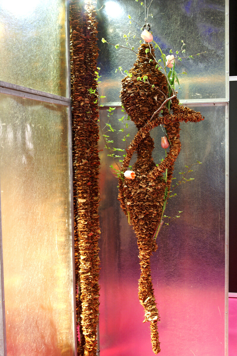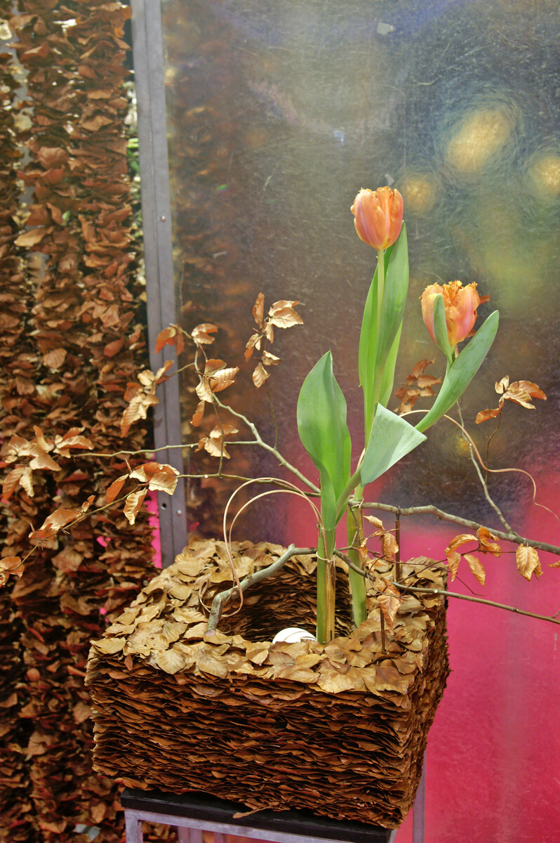 Begleitet wurde die florale Leichtigkeit der Tulpen von einem Werkstoff, der auf den ersten Blick ungewöhnlich erscheint: Buche in all ihren Erscheinungsformen. Stamm, Ast, Zweig und Blatt bildeten den gestalterischen Gegenpol zur Frische der Blüten. Die Entscheidung für dieses „Trockene–Vergangene“ fiel in einem gemeinsamen Prozess innerhalb der Gruppe. Auf die Früchte der Buche wurde bewusst verzichtet – sie hätten eine zu starke Assoziation an die Winter- und Weihnachtszeit geweckt.