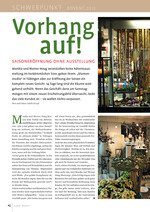 Mit dem Schwerpunkt „Advent 2012“ rücken wir wesentliche Aspekte zur Profilierung des Fachhandels in den Vordergrund. Annette Kamping präsentiert Werkstücke, die sich einerseits durch die verwendeten Materialien, andererseits durch vielfältige Formen vom „gewöhnlichen“ Angebot unterscheiden. Bei aller Krea tivität des Einzelnen aber muss ein roter Faden zu erkennen sein, fordert Olaf Schroers – erst dann wird Advent für die Kunden zum Erlebnis. Im Beitrag