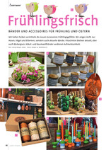 Mit hellen Farben vermitteln die neuen Accessoires Frühlingsgefühle. Wir zeigen nicht nur Hasen, Vögel und Eiformen, sondern auch aktuelle Bänder. Filzschnüre bleiben aktuell, aber auch Bäckergarn, Häkel- und Baumwollbänder verdienen Aufmerksamkeit.