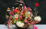 Werden Blumen zwar bedacht angeordnet, aber nicht akribisch inszeniert, sondern mit einer gewissen Spontanität, können ungewöhnliche Kombinationen entstehen, die weder in die üblichen Kategorien von richtig und falsch passen noch den Bildern von Mode oder Trends entsprechen. Ausdrucksstark oder ausdruckschwach, alle beteiligten Werkstoffe sind gleichberechtigt, keiner betont dominant. Die Wirkung liegt in der Vielgestaltigkeit. Einzelne Teil können auch nur einmal auftreten ohne dass das Gesamtbild schwankt. Nun, es kommt darauf an, mit welchem Auge das Werkstück gesehen wird. Kann der Betrachter ohne vorgefasste Erwartung schauen? Kann er nach Tagen eine Veränderung als schlüssig und nicht als disharmonisch empfinden? Ein abfallendes...