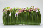 Das Gras als Werkstoff zog sich durch alle Meisterarbeiten von Alexander Meckel. Bei einem Werkstück ließ er den feinen Linien freien Lauf, doch beim Brautschmuck und der Kranzform bändigte er die zarten Pflanzenteile, indem er sie in akkurater Fleißarbeit zur Form ordnete. Der zurückhaltende Ausdruck des Grases half ihm, das eigentliche Thema sichtbar zu machen.