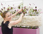 Martina Frei ist eine zarte, eher kleine Person, ihre floristischen Gestaltungen jedoch sind meist großzügig dimensioniert und entsprechend imposant. Hier mag die Erklärung liegen, weshalb sie sich lieber mit horizontal denn mit vertikal ausgerichteten Werkstücken auseinandersetzt. Dann ist die Chance höher, dass sie noch drüber blicken kann. Es gibt weitere Gründe.