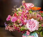 In diesem Strauß sind vorwiegend Blumen in Rosa- und Rottönen kombiniert - mit reizvollen Ausreißern in Richtung Blau und Orange. Je nachdem, von welcher Seite man den Strauß betrachtet, entdeckt man immer wieder andere Blumen. Im Strauß sind so unterschiedliche Gestalten wie Rose, Lupine, Lilium martagon, Lysimachia atropurpurea und Wicken zu einem harmonischen Ganzen zusammengefügt. Orchidee und Känguruhpfötchen, die ursprünglich auf anderen Kontinenten zu Hause sind, sind wie selbstverständlich dabei.
