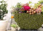 Im Herbst haben Kränze Hochsaison. Kränze zum Aufhängen sind im Blumenstudio genauso gefragt wie Kränze zum Legen. Sie werden aus vielfältigen Werkstoffen oder auch "mono" gebunden, Kränze für den Tisch werden meistens gesteckt. "Bei Mono-Arbeiten wird manchmal noch ein Akzent gesetzt, zum Beispiel mit einer Vanda-Blüte", berichtet Jörg Zabel. Mal wird Wert auf einen klaren Umriss gelegt, mal steht ein lässiges Erscheinungsbild im Vordergrund. Alles wird mit frischen Werkstoffen gestaltet. Auch farblich ist das Angebot breit gefächert, von "viel Farbe" bis zu dezenten Schattierungen innerhalb einer oder weniger Farben.