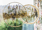 Basis für die beiden Loops sind Eisenreifen. Für den linken Loop werden angefeuchtete Binsen um den Reifen gebunden, dann werden Wickeldrähte in der Waagerechten quergespannt, sodass eine stabile, rechteckige Fläche entsteht. Diese wird in Chaos-Technik aus Binsenknäueln geflochten und lässig mit Trockenblumen dekoriert. Für den rechten Loop wird der Reifen zunächst mit Gräsern umwickelt, dann wird farbiger Wickeldraht kreuz und quer auf der Fläche verspannt und mit Trockenblumen ergänzt.