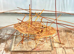 Eine Baumscheibe aus dem Bedarfshandel wird mit verschieden starken Bohrern durchlöchert, sodass auch dickstielige Floralien durchgesteckt werden können. Die Scheibe liegt auf einem "tischartigen" Gestell aus Weidenstäben, das mit brauner Wachsschnur zusammengebunden wurde. An statisch wichtigen Punkten empfiehlt es sich, das Holz leicht mit dem Messer einzukerben, damit die beiden zusammengefügten Stäbe eng aneinander liegen. So wird ein Verrutschen vermieden und die Bindung hält alles stabil zusammen. Um die Scheibe zu integrieren, kann man auch Stäbe durch die Löcher stecken und fixieren. Eine leichte Schrägstellung und freier angeordnete Zweige steigern die asymmetrische Wirkung. Die auf diese Weise entstandene Basis steht auf einem mit Wasser gefüllten Teller.