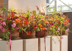 Meisterarbeiten zu schaffen, die neben formaler Einmaligkeit authentisch sind, war für Stefanie Brecht unabdingbar. So erklärt sich, dass sie für ihre Kranzform alle Schattierungen wählte, die die Farbe Orange aufweisen kann. Als hellste Nuance setzte die Floristmeisterin Gelbtöne mit einem winzig kleinen Anteil der Nachbarschaftsfarbe ein. Über unzählige Farbbrücken arbeitete sie sich durch die ganze Orange-Palette, um letztlich mit einem Farbton zu schließen, der sich am ehesten als orange beseelter Braunton beschreiben lässt.