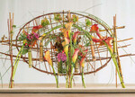 Nun muss der ovale Ring an verschiedenen Stellen mit einer Wachsschnur gebunden werden. Das Material ist organisch, klebt ein wenig aneinander und sollte an den Enden gut verzwirbelt und am Schluss noch einmal mit der flachen Zange fest zugedreht werden. Das ist aufwendiger als gewohnt, aber auch völlig nachhaltig. Ist der Ring fertig zugebunden, muss man ihn "durch die Finger gehen lassen", das heißt nachbiegen, damit er in einer guten Form bleibt. Dann schneidet man aus geraden Weidenstäben die Senkrechtstützen des Konstrukts. Man bindet jeweils zwei Stäbe am oberen spitzen Ende mit der Wachsschnur zusammen. Die "Füße" unten sind weiter auseinander und werden durch einen weiteren kürzeren Stab verbunden: jeweils ein Fuß für links und...