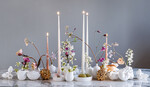 Die Vorliebe für „zusammengesetzte“ Tischdekorationen hält an, aber es müssen ja nicht immer Glasgefäße mit Wiesenblumen sein. Detlef Klatt zum Beispiel hat mit Gefäßen seiner Firma Klatt Objects und Raritäten von Gärtnern aus der Nachbarschaft eine Tischdekoration gestal- tet, die für Überraschung sorgt und gleichzeitig zum Zeitgeist passt. Dazu gibt er Tipps, wie das Thema Tischschmuck auch auf kleiner Fläche inszeniert werden kann.