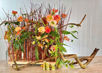 Das erinnert an einen Reiserbesen, natürlich mit längeren Stäbchen. Obwohl ein blockhafter Körper entsteht, ist ausreichend Raum für teils rankende und schwungvoll bewegte Blüten. Die Stäbe sind zwischen 20 und 40 cm lang, es könnte auch Ried oder Bambus sein. Hier wurde konsequent mit Weidenstäben gearbeitet, um eine durchgängige Werkstoff-Story zu haben.