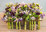 Fixiert sind die Stäbe jeweils mit zwei Bindepunkten. Als Verbindung zur Blütenebene stehen sie ein wenig nach oben über. Das Weidenstabgitter wird aus gleich langen Salix-caprea-Stücken gebunden – mit der Wachsschnur, was erst einmal etwas mit Übung zu tun hat. Wichtig ist, dass die Bindungen über Kreuz einmal rechts und einmal links herum in jeweils gleicher Häufigkeit erfolgen, damit kein Drall nach einer Seite entsteht und das Gitter schräg wird.
