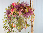 Das große Glasgefäß wirkt als wären die Blumen "einfach nur eingestellt". Aber nein, sie sind bewusst und stabil angeordnet, sodass auch beim Transport nichts durcheinandergeschüttelt werden kann. Viel frisches Wasser garantiert gute Haltbarkeit, der Transparenz der Glasvase steht nichts im Weg. Auch abfließende Werkstoffe sollte man sorgfältig einplanen - in diesem Fall kleinblättrige Hedera-Ranken und Pfefferbeeren, die auf die Wachsschnur gebunden sind und etwas Farbe "nach unten" bringen. Außerdem werden Bambusröhrchen als Wasserquelle für Rosen, die außerhalb der Vase hängen, an ein paar blattlose Olivenzweige gebunden.
