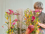 Zum Einstecken kann man eine Flachzange zu Hilfe nehmen, die auf ihren Innenseiten für einen weicheren Griff und das Vermeiden von Beschädigung mit etwas Heißkleber bestrichen ist. Dann rutschen die Stäbchen auch nicht wieder heraus. Um Asymmetrie auf dem „engen Raum“ zu ermöglichen, wird eine große Gruppe Ried gesteckt und mit etwas Abstand eine kleine Gruppe. Dann werden Röhrchen aus Bambus geschnitten. Die natürlichen Nodienböden sind wasserdicht. Sie werden mit Wachsschnur jeweils zweimal festgebunden. Die Mehrheit der Röhrchen ist parallel fixiert, ein Teil aber auch etwas diagonal, um einige Floralien schräg überschneidend einsetzen zu können. Es gibt Höhenunterschiede, aber alle Wasserquellen sind im unteren Drittel der Arbeit...
