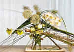 Die Floralien stehen in einer flachen Schale in Wasser. Verwendet werden ruhig wirkende, glatte Stiele mit Blüten nur an der Spitze. Bei einer sorgsamen Auswahl reichen wenige Blumen. Blickpunkt ist dort, wo sich die Mehrheit der floralen Formen trifft. Wichtig ist eine Tiefenstaffelung, kein Nebeneinander der Blumen. Auf dem Wasser schwimmen Wasserlinsen, die in ihrem Assimilationsprozess das Wasser sauberer halten. Von der Seite betrachtet, ist zu erkennen, dass die meisten Formen gestreckte, gerade Linien bilden. Ein geringer Anteil ist rund, abgerundet oder gebogen. Eine solche gestalterische Entscheidung ist wichtig, sie macht Formgebung möglich.