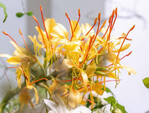 Neben Blumen wie Kosmeen und Schafgarbe wählte Elisabeth Schoenemann Serruria florida ‘Blushing Bride’, Gloriosa und Grevillea. Dem natürlichen Ausdruck schadet das keineswegs – Gestaltung lebt von neuen Wegen und neuen Interpretationen. Gleichzeitig ist deutlich zu erkennen, dass die Floristmeisterin ihr Handwerk beherrscht. Wir empfehlen drei weitere Beiträge zum Thema – nachzulesen auf unserer Website: „Undone Style“(1/2019), Webcode flo5623 „Wie gepflückt!“(6/2019), Webcode flo5624 „Garden Style“ (7/2020), flo5625